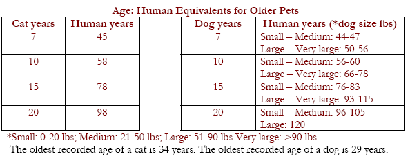 A: It varies, but cats and small dogs are generally considered geriatric at the age of 7. Larger breed dogs tend to have shorter life spans and are considered geriatric when they are approximately 6 years of age. Owners tend to want to think of their pet’s age in human terms. While it is not as simple as “1 human year = X cat/dog years”, there are calculations that can help put a pet’s age in human terms: