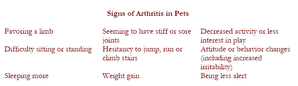 A: First, talk to your veterinarian and have them examine your pet. Your pet might have arthritis. Older pets, especially large dogs, are vulnerable to arthritis and other joint diseases, and the signs you see can vary. This chart provides the basic signs you might see if your pet has arthritis; you might see one or more of these signs in your pet.